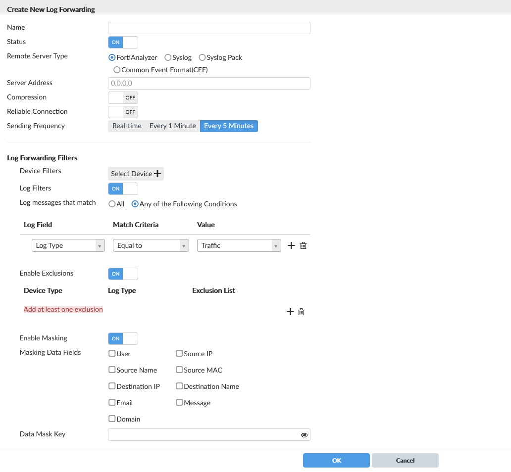 - Fill in the information as per the below table, then click OK to create the new log forwarding. The FortiAnalyzer device will start forwarding logs to the server.