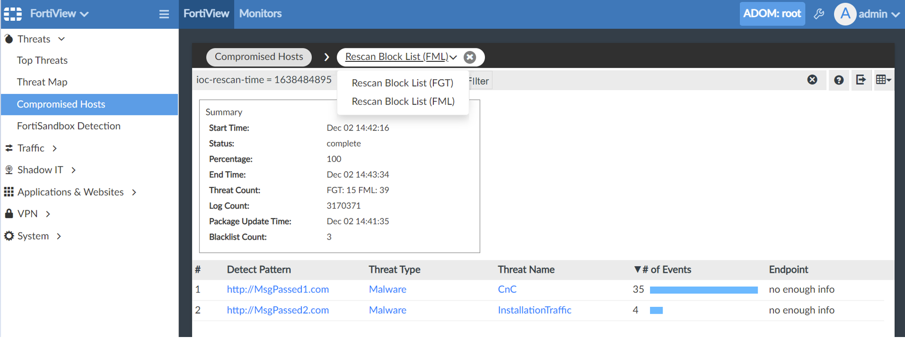 - Threat Count: The total number of logs with threats. The threat count for FortiGate and FortiMail is displayed separately in rescan tasks.