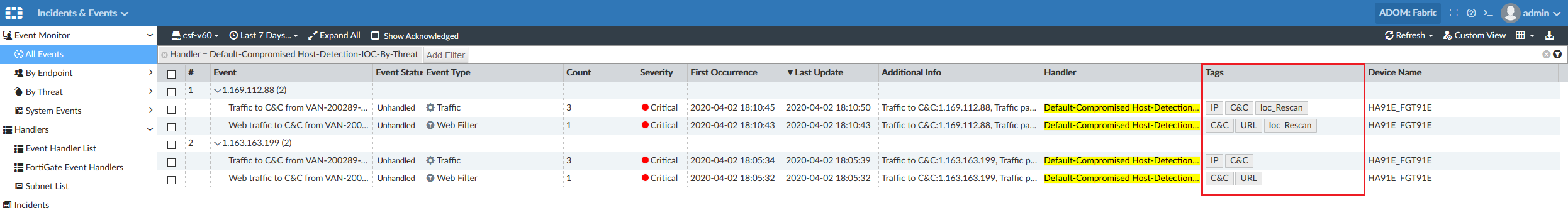 When IOC rescan is performed, the Ioc_Rescan tag is added to rescanned logs. Event handlers which include the Ioc_Rescan tag in their filters will process rescanned logs and generate new alerts tagged with Ioc_Rescan. Real-time logs matching these event handler filters continue to generate alerts without the Ioc_Rescan tag.