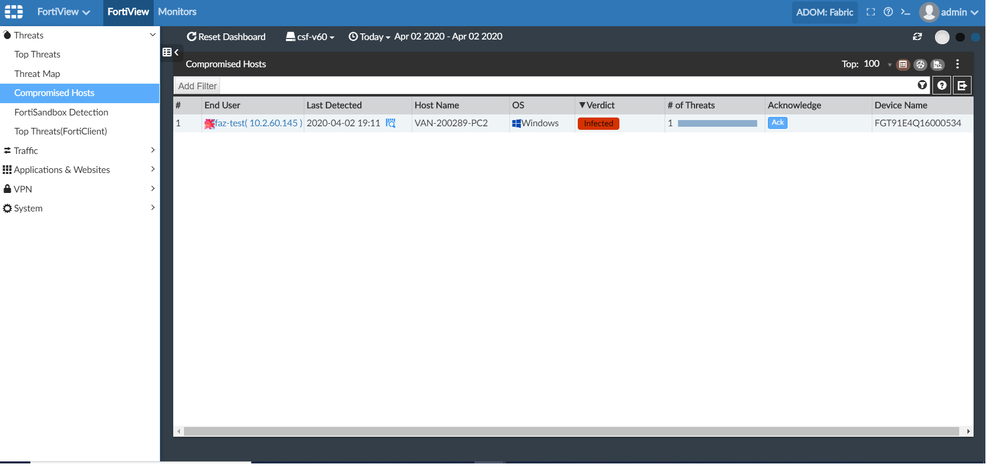 - Go to FortiView > FortiView > Threats > Compromised Hosts.