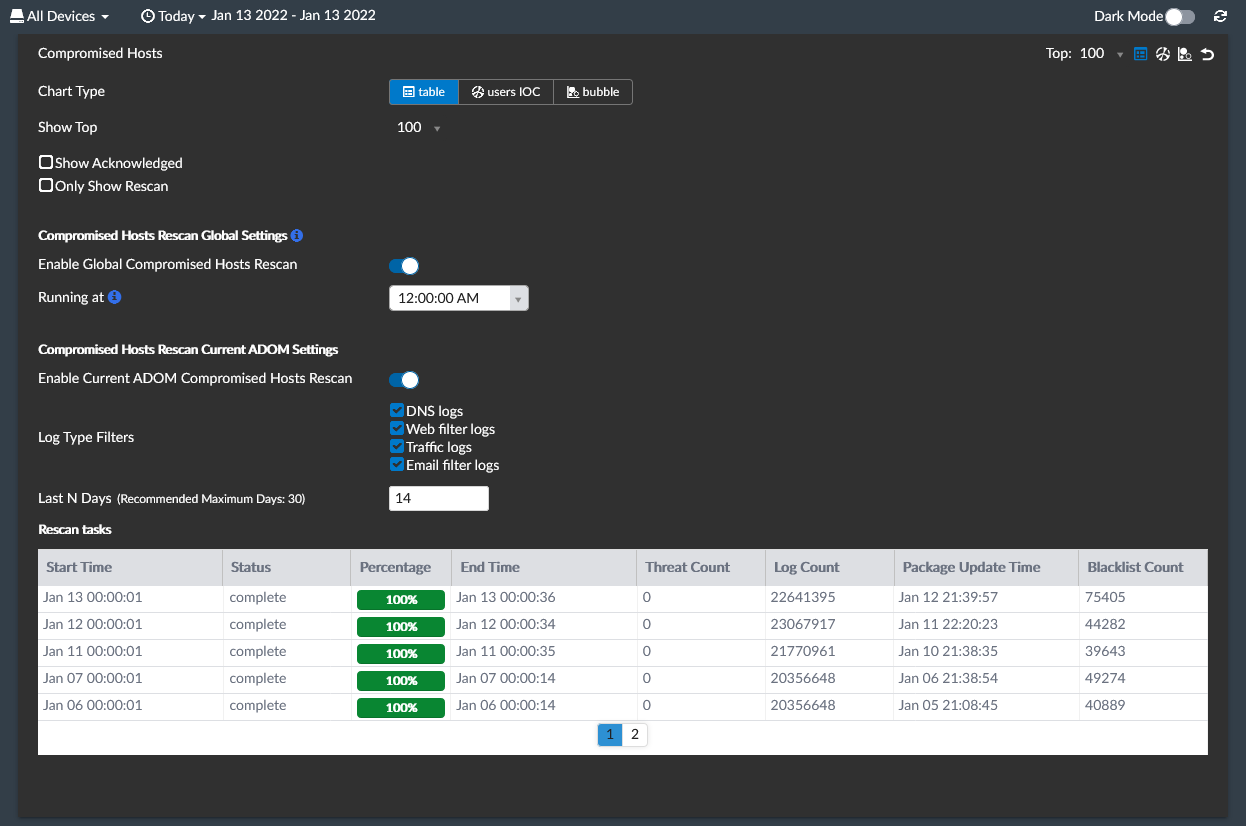 Compromised Hosts can be configured to scan previous entries on regular intervals or when a new package is received from FortiGuard so that FortiAnalyzer performs a rescan using the latest available definitions.