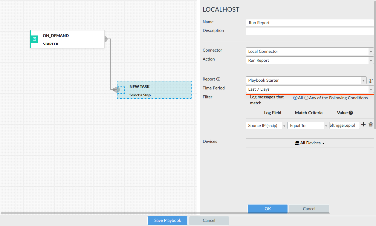 For example, the Run Report action can include a filter for the endpoint IP address from the event that triggered the playbook.