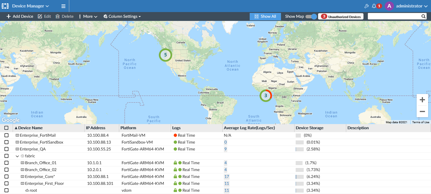 Use the Device Manager pane to add, configure, and manage devices and VDOMs.