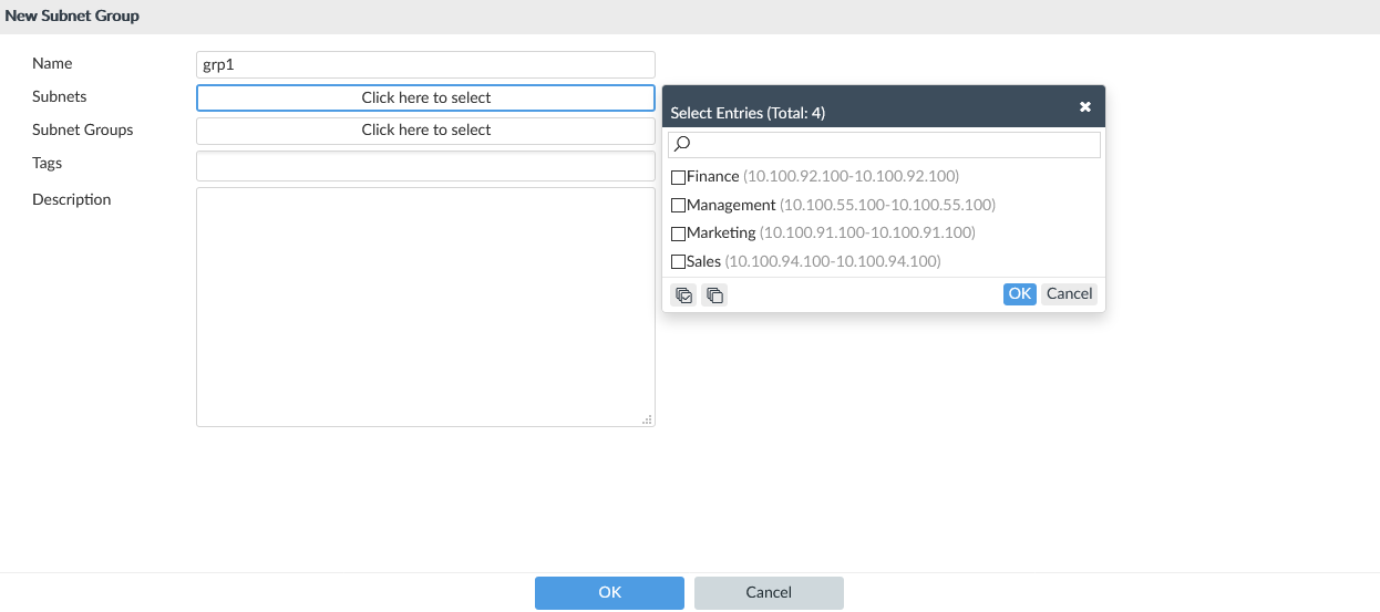 - Select the subnet entries to be included in the group and select OK in the pop-up window.