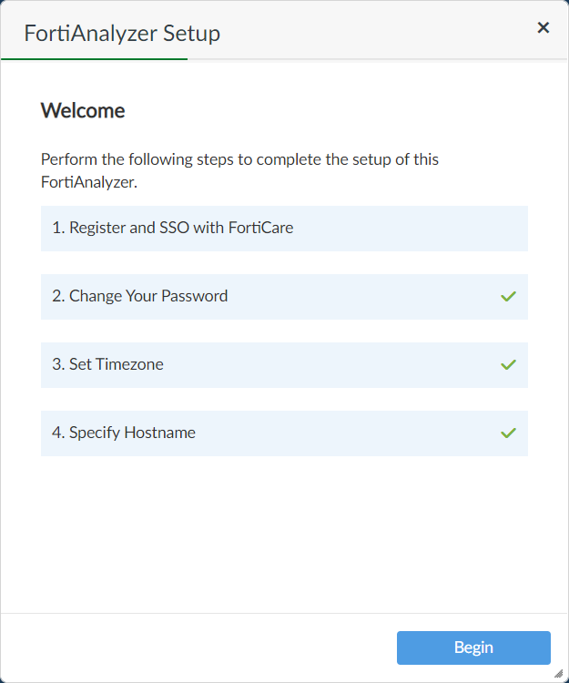 When actions are complete, a green checkmark displays beside them in the wizard, and the wizard no longer displays after you log in to FortiAnalyzer.