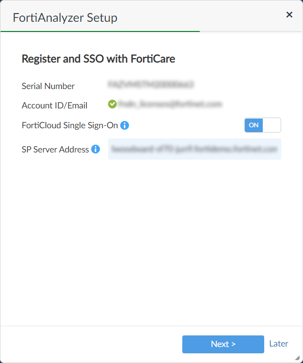 When enabled, you must also enter the SP Server Address. For more information, see FortiCloud SSO admin authentication . - Click Next.