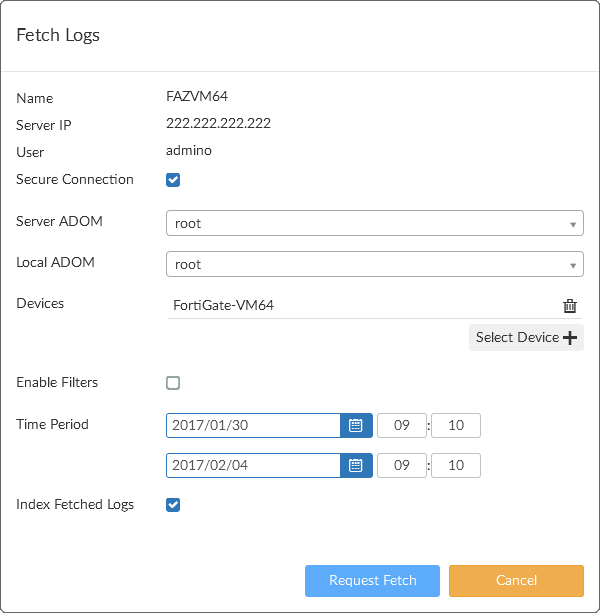 A fetch request requests archived logs from the fetch server configured in the selected fetch profile. When making the request, the ADOM on the fetch server the logs are fetched from must be specified. An ADOM on the fetching client must be specified or, if needed, a new one can be created. If logs are being fetched to an existing local ADOM, you must ensure the ADOM has enough disk space for the incoming logs.