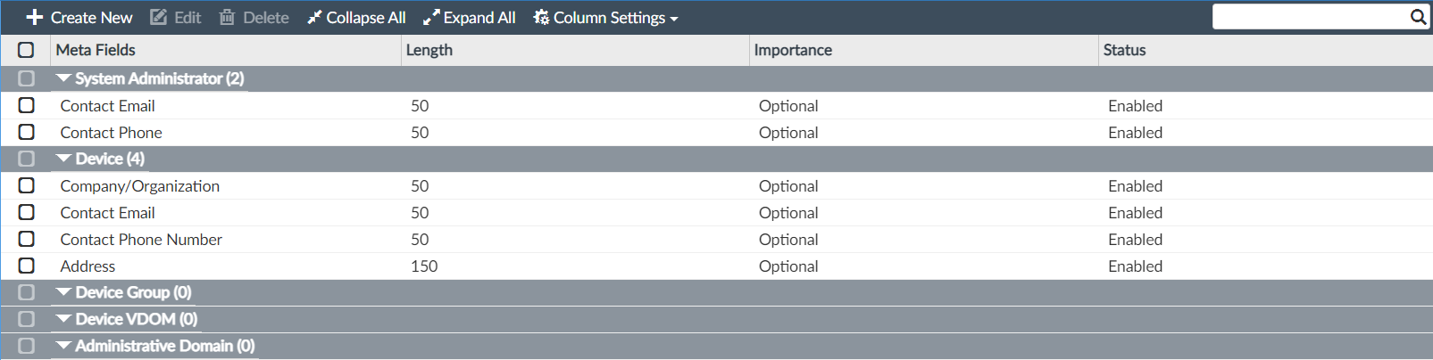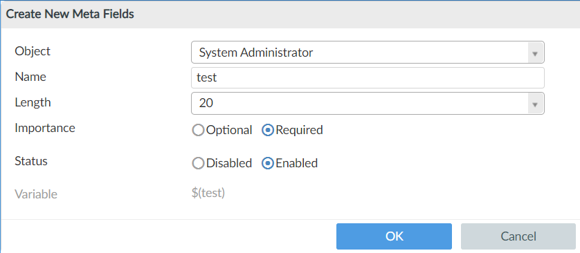 Meta fields allow administrators to add extra information when configuring, adding, or maintaining FortiGate units or adding new administrators. You can make meta fields required or optional.
