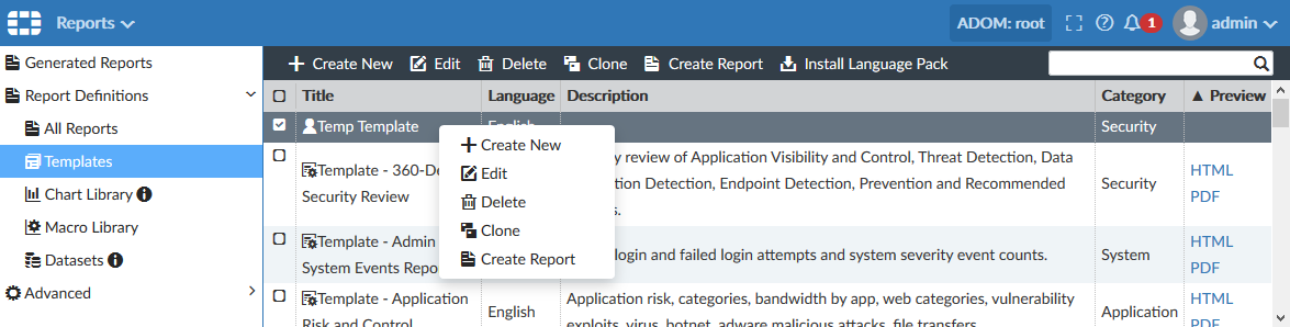 In the following example on the Reports pane, you can right-click a template, and select Create New, View, Clone, or Create Report.