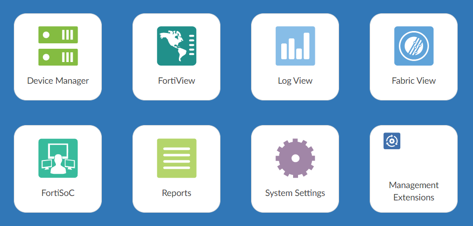 When you log into the FortiAnalyzer GUI, the following home page of tiles is displayed: