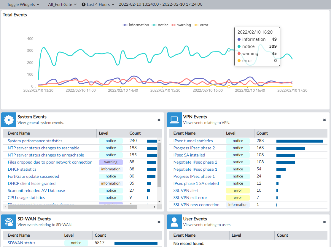 You can monitor all types of event logs from FortiGate devices in Log View > FortiGate > Event > All Types. This dashboard displays the total counts for event logs by type, name, and level. You can filter the dashboard by FortiGate device(s) and time frame for the event logs.