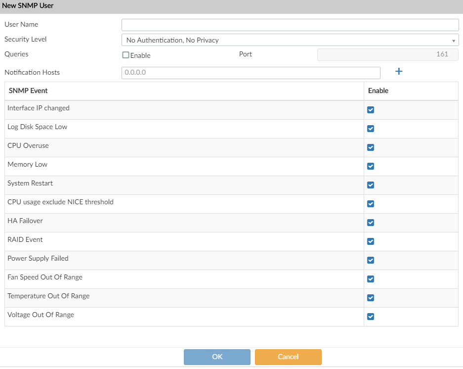 - Authentication, No Privacy: Select the Authentication Algorithm (SHA1, MD5) and enter the password.