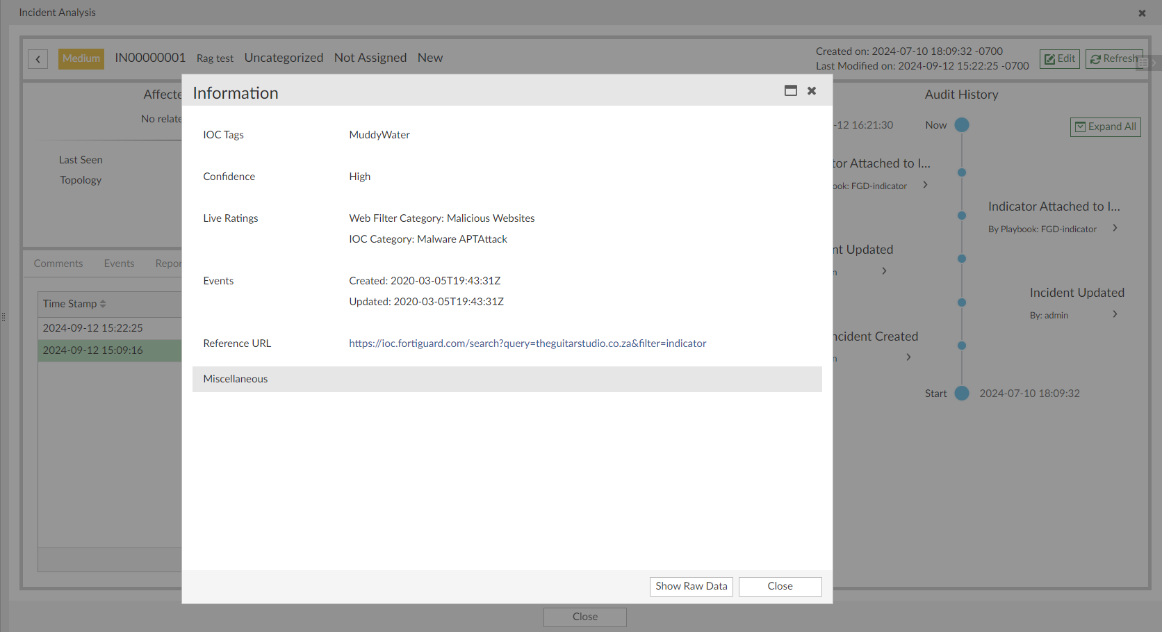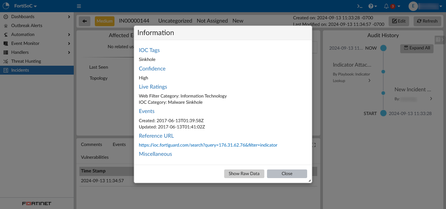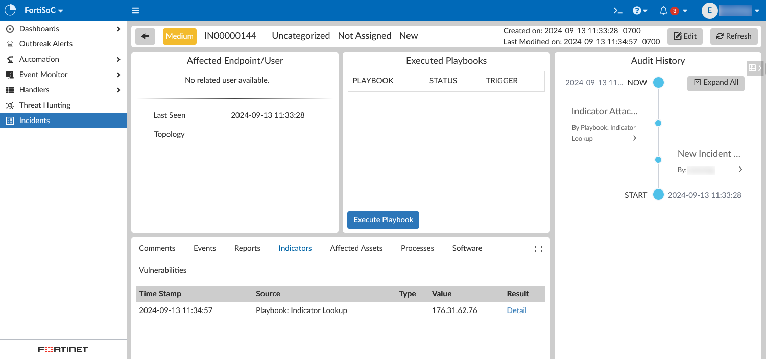This indicator_value is a malicious IP, URL, or domain. The FortiGuard connector checks the FortiGuard threat database for information related to the indicator. If there is a match for the entered IP, URL, or domain in the threat database, the information from FortiGuard will be attached to the incident.