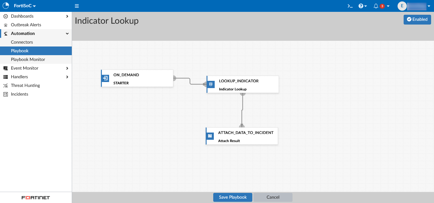 In FortiSoC > Automation > Playbook, create a new playbook from scratch.