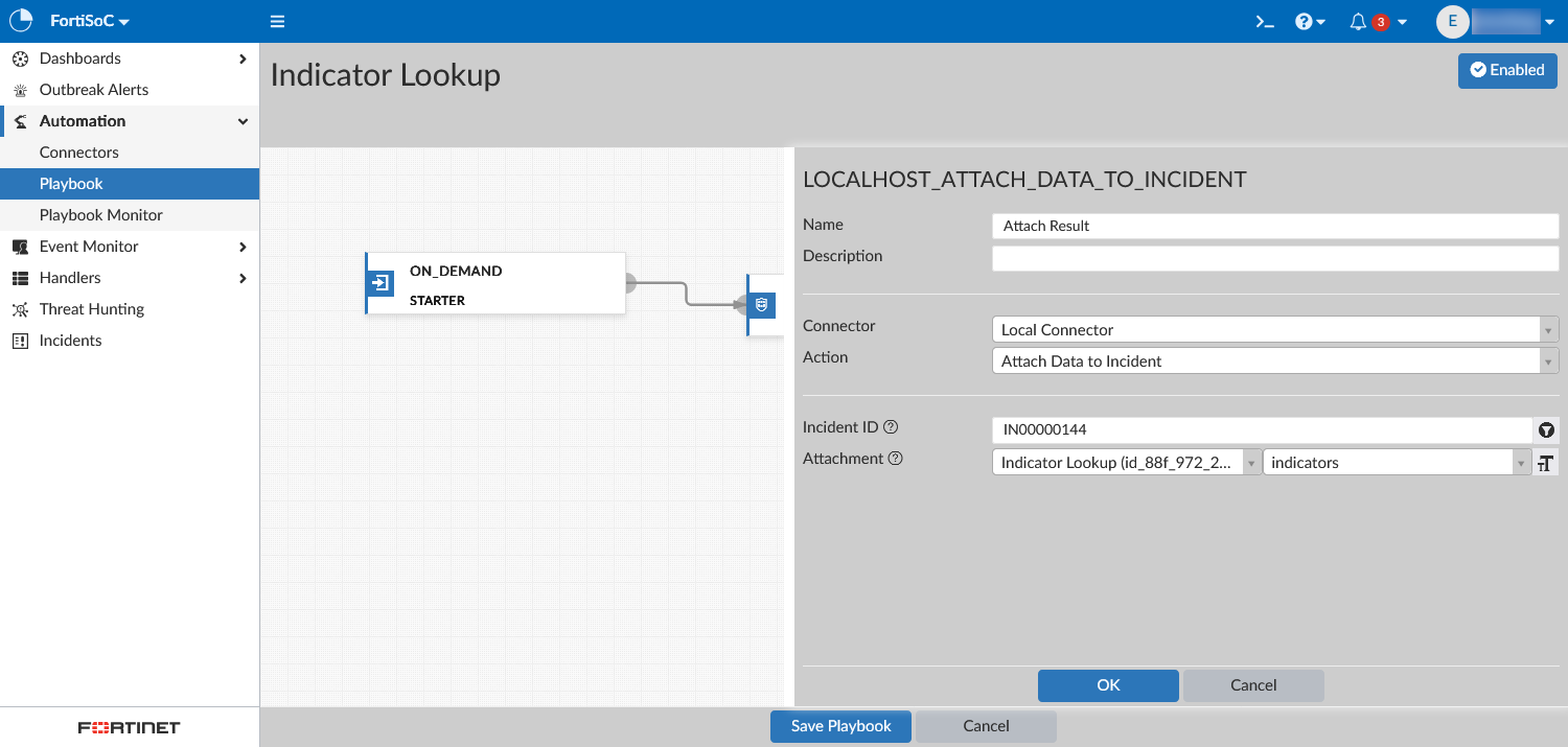In the below example, a playbook is created to manually perform the indicator lookup and attach the data to an existing incident.