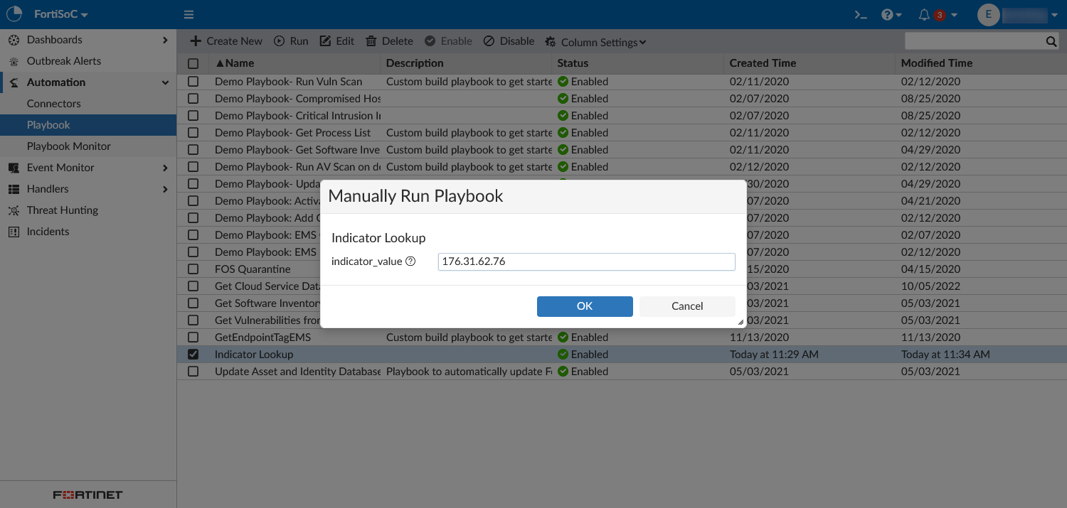 When you run the playbook, you must enter an indicator_value.