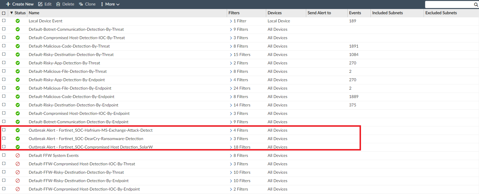 Event handlers created by the FortiAnalyzer Outbreak Detection Service are displayed with the Outbreak Alert prefix. See Event handlers.
