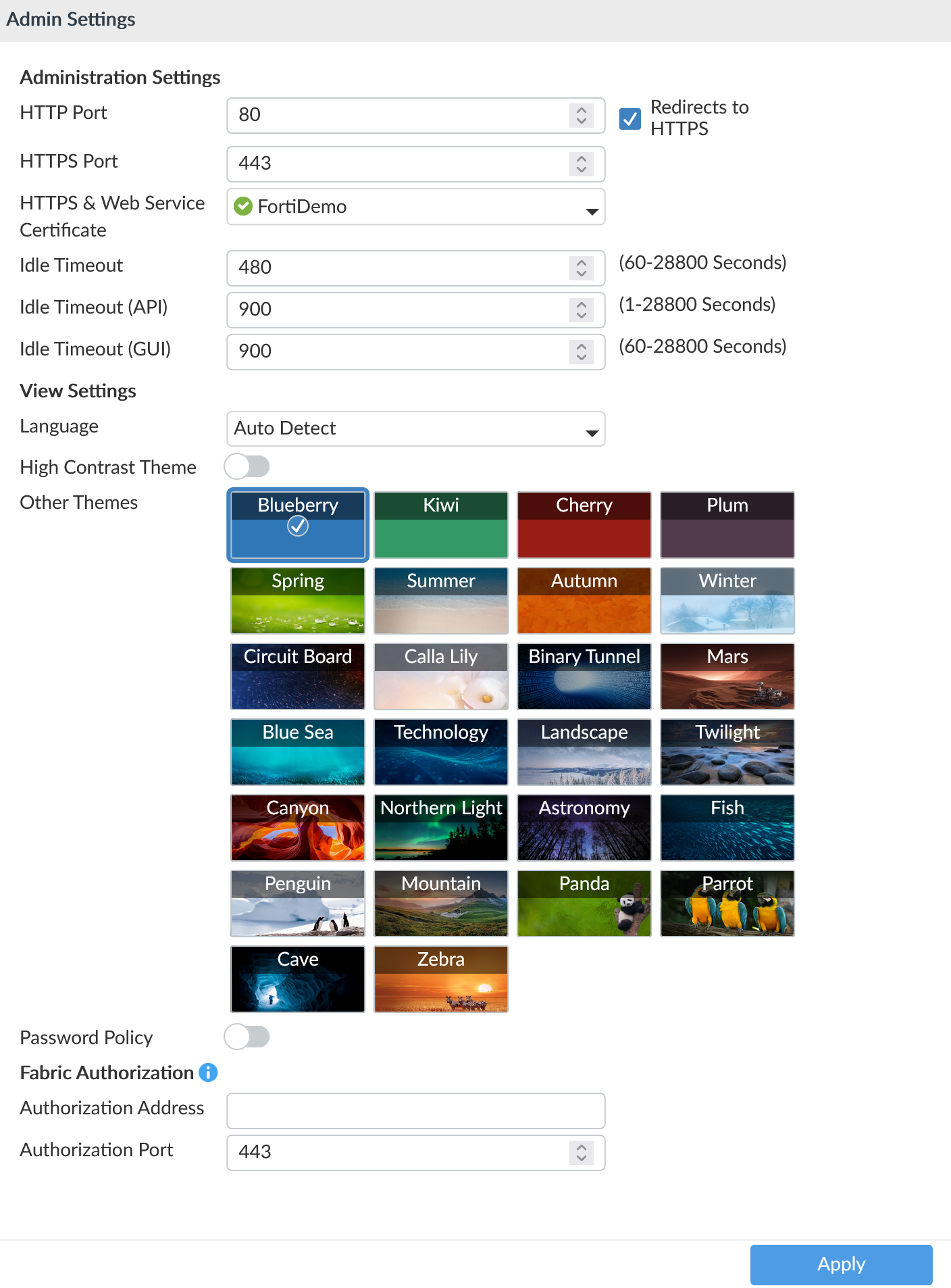 Select a theme for the GUI. The selected theme is not applied until you click Apply, allowing to you to sample different themes. Default: Blueberry.