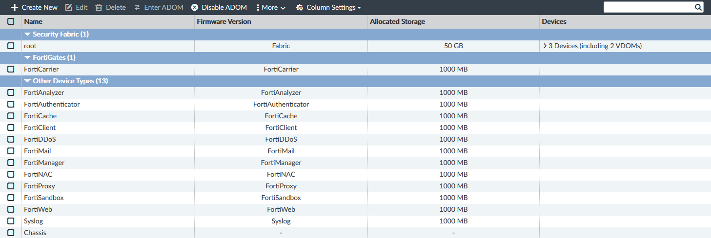 The name of the ADOM. ADOMs are listed in the following groups: Security Fabric, FortiGates and Other Device Types. A group can be collapsed or expanded by clicking the triangle next to its name. |