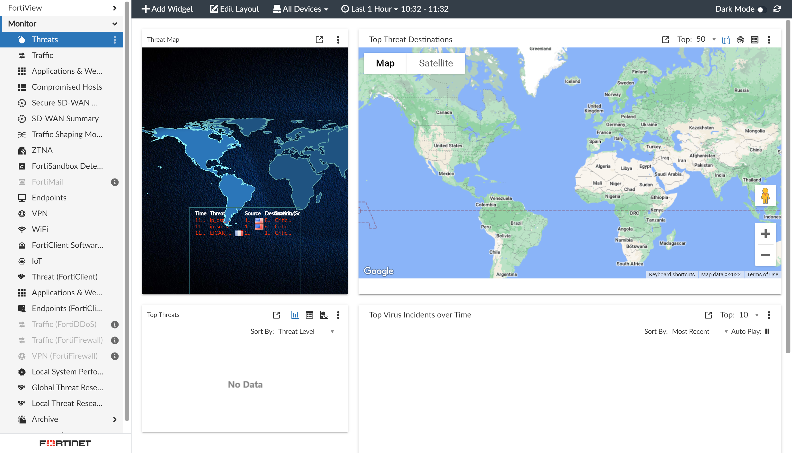 For example, the default Threat Monitor dashboard includes four widgets: Threat Map, Top Threat Destinations, Top Threats, and Top Virus Incidents Over Time. These widgets can be removed, enlarged, reduced, or customized, and new widgets can be added to the dashboard.