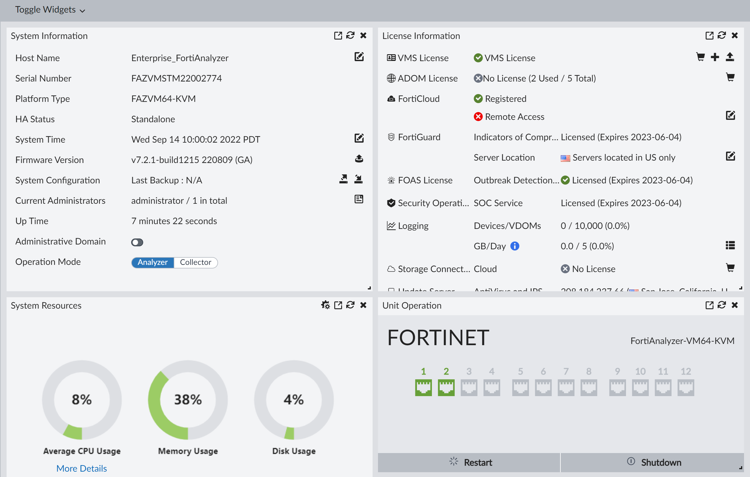 Displays status and connection information for the ports of the FortiAnalyzer unit. It also enables you to shutdown and restart the FortiAnalyzer unit or reformat a hard disk. For more information, see Unit Operation widget. |