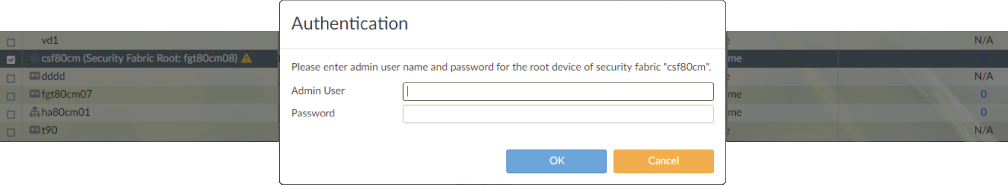 - Authenticate the Security Fabric group by clicking the Warning icon (yellow triangle) beside the corresponding FortiGate root.