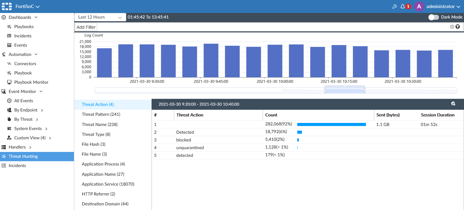 FortiSoC includes the Threat Hunting pane which offers a SOC analytics dashboard using the SIEM database. Threat Hunting uses cached data to allow SOC analysts to quickly drilldown on logs in fields of interest. To view the Threat Hunting dashboard, go to FortiSoC > Threat Hunting. The Threat Hunting dashboard includes a log count chart and SIEM log analytics table.