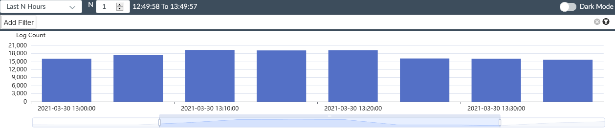 You can zoom in and out on the displayed time range by using your mouse's scroll wheel or by adjusting the timebar below the graph. You can adjust the time bar by dragging the start and stop bars on either side of the selected time range, or by clicking and dragging the entire time range to the left or right. Only logs displayed within the time period visible in the chart are shown in the SIEM log analytics table.