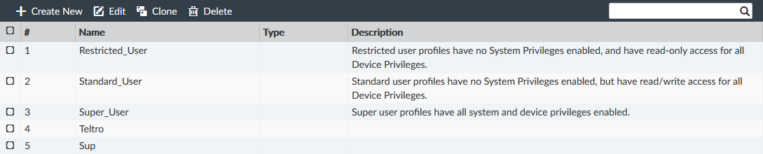 Super user profiles have all system and device privileges enabled. It cannot be edited. |
