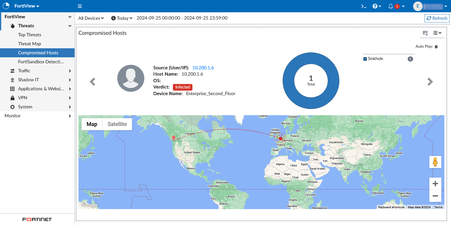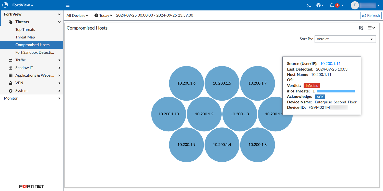 Go to FortiView > Threats > Compromised Hosts.