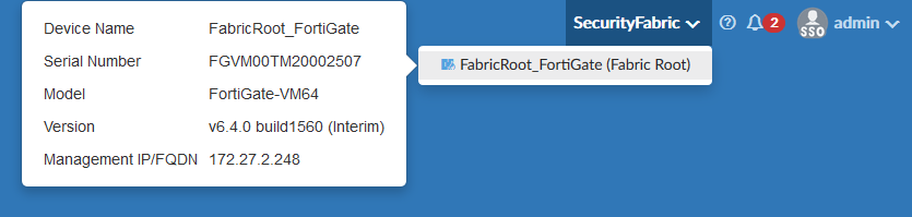 Fabric devices configured to the IdP can be accessed through the Security Fabric members dropdown which appears in the top-right corner of the toolbar.