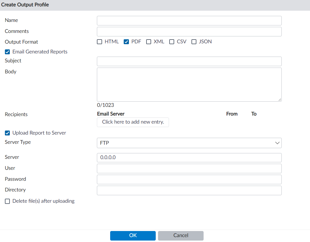 You must configure a mail server before you can configure an output profile. See Mail Server. |