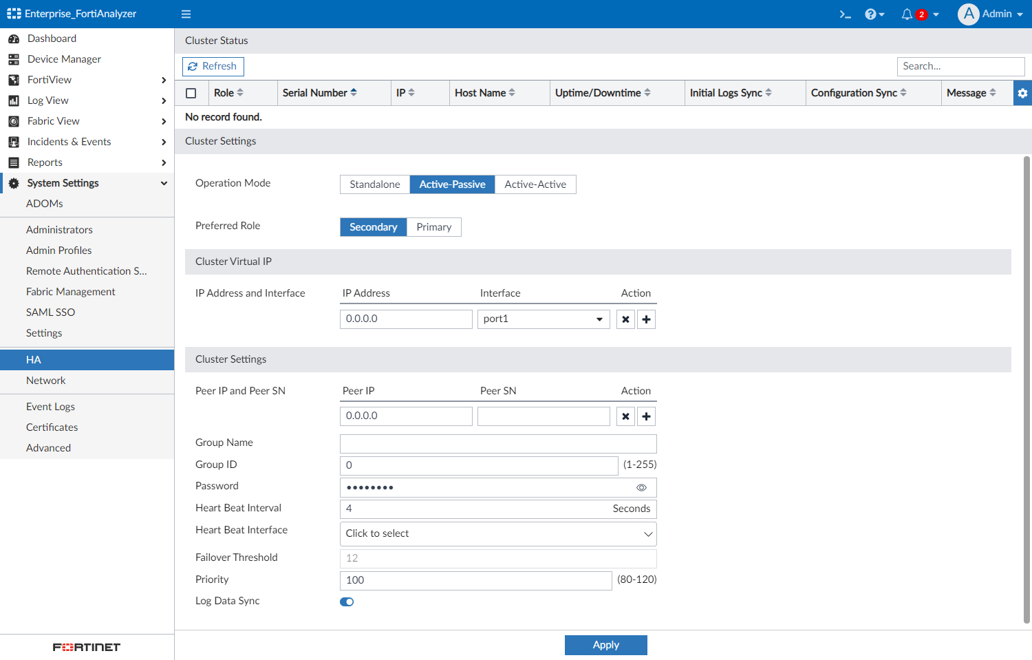 To configure HA options go to System Settings > HA and configure FortiAnalyzer units to create an HA cluster or change cluster configuration.