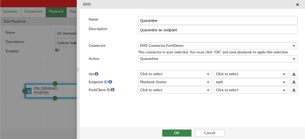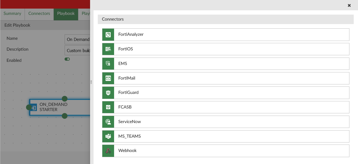 Once created, playbooks can be enabled or disabled through the playbook editor. Enabled playbooks will run as soon as their trigger conditions are met. Playbooks configured with the On_Demand trigger start when manually initiated by the administrator in Fabric View > Automation > Playbook or an Incident's Analysis page.