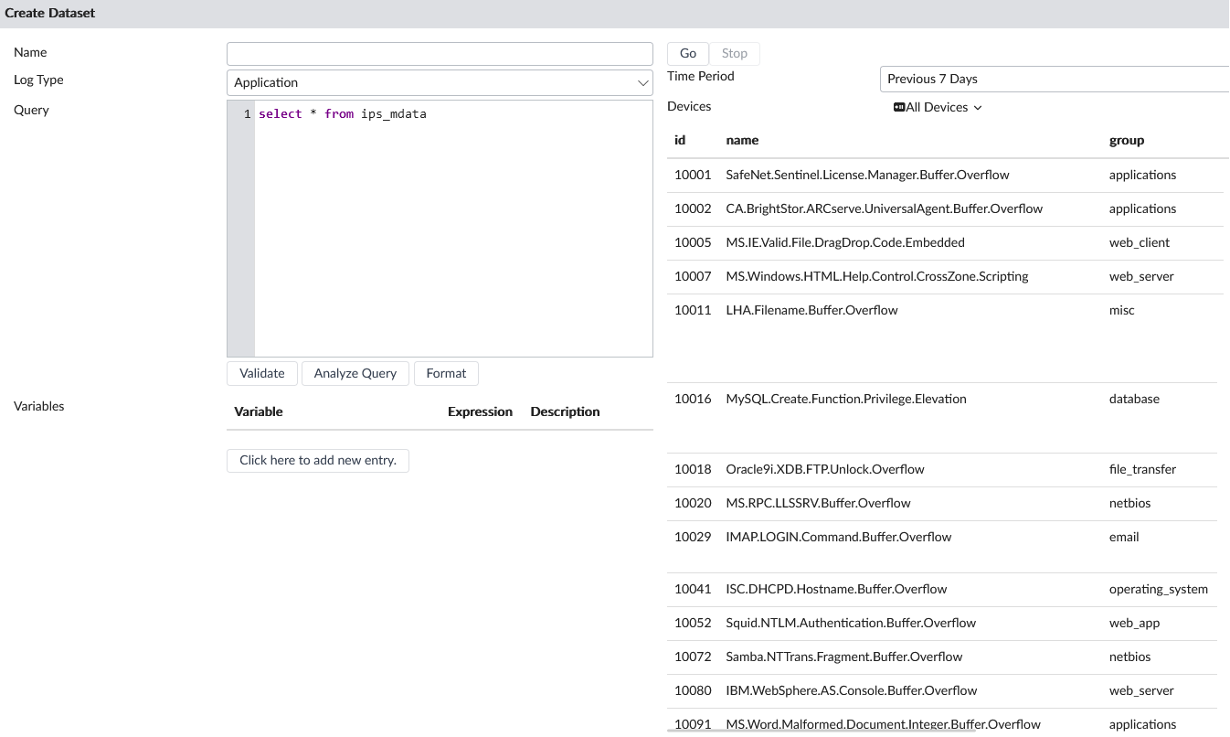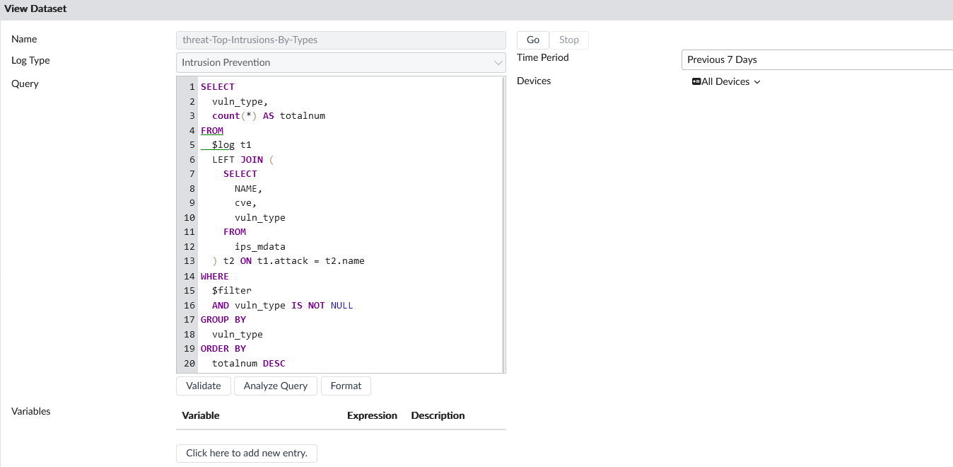 As an example, in the threat-Top-Intrusions-By-Type dataset, the ips_mdata metadata table is referenced. The ips_mdata table is a collection of intrusion prevention related metadata from FortiGuard that is used by this dataset to add information about vulnerability types, vulnerability names, and CVE data to intrusion prevention logs.