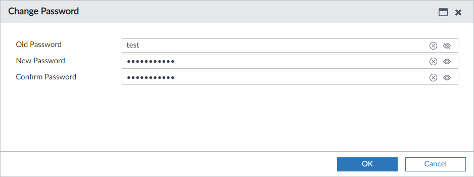 For example, see the image of the Change Password dialog below. In this example, the Old Password is toggled to show the password. The other fields are toggled to hide the password.