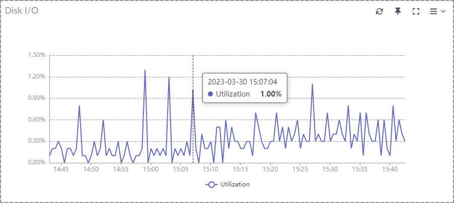 The Disk I/O widget shows the disk utilization (%), transaction rate (requests/s), or throughput (KB/s), versus time.