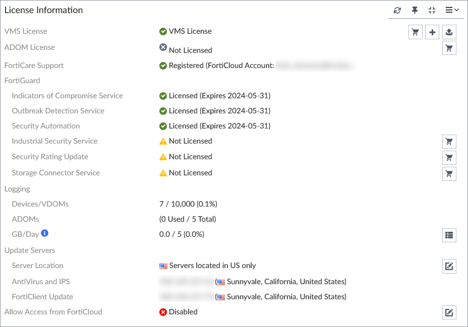 The license status. Click the purchase button to go to the Fortinet Customer Service & Support website, where you can purchase a license. |