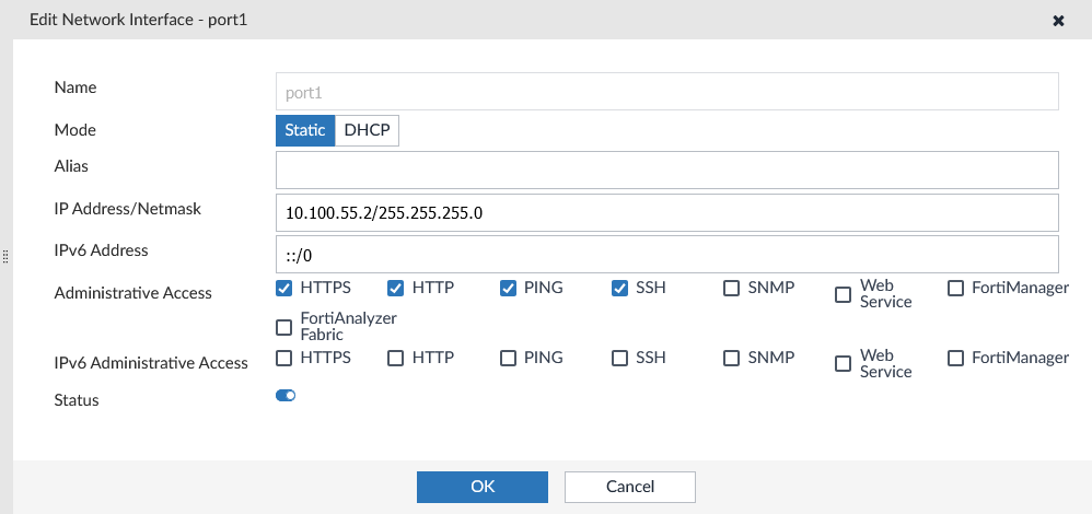 Select the allowed administrative service protocols from: HTTPS, HTTP, PING, SSH, SNMP, Web Service, FortiManager, and FortiAnalyzer Fabric.