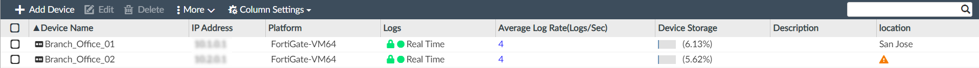 In the following example, a column named location is displayed for the required meta field named location. A value of San Jose is defined for one device, but no value is defined for the other device.