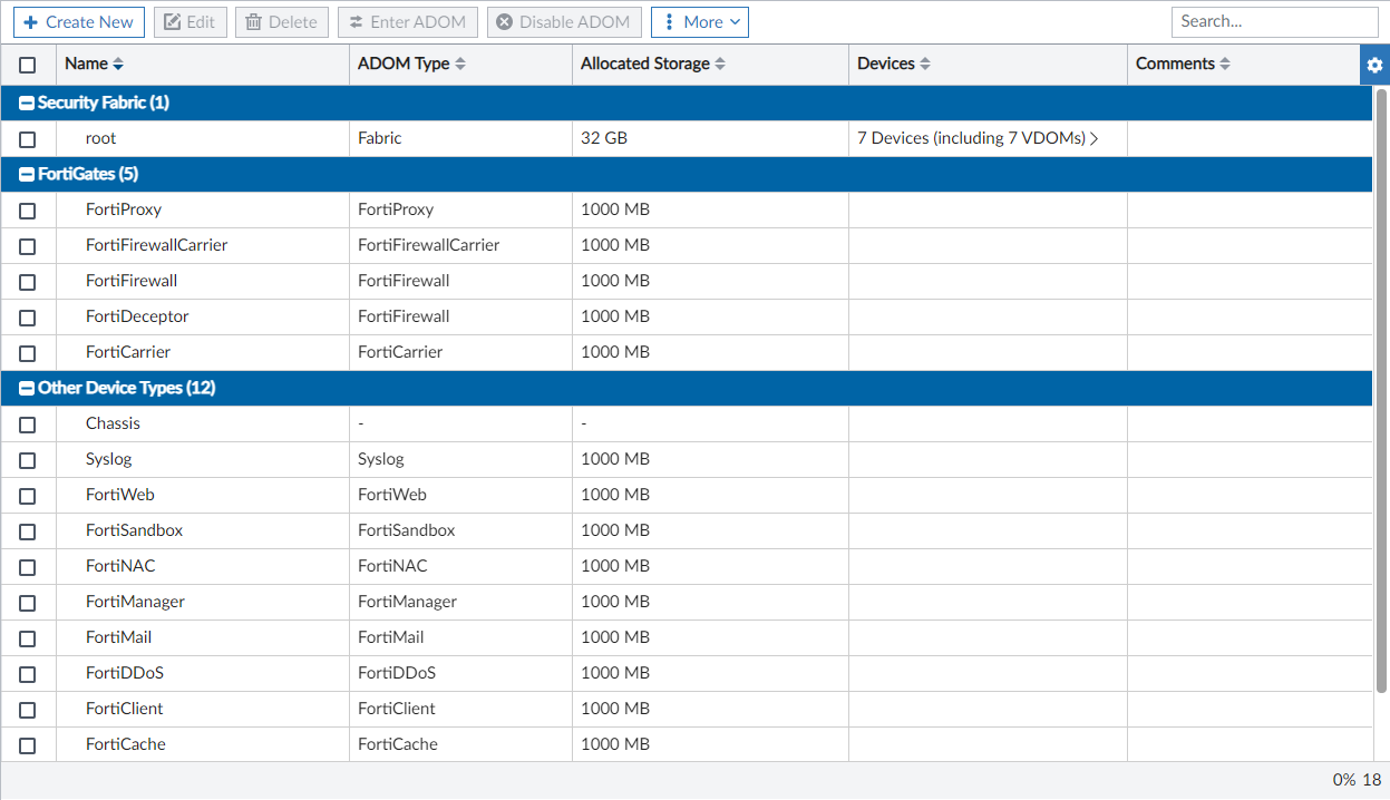 The name of the ADOM. ADOMs are listed in the following groups: Security Fabric, FortiGates and Other Device Types. A group can be collapsed or expanded by clicking the triangle next to its name. |