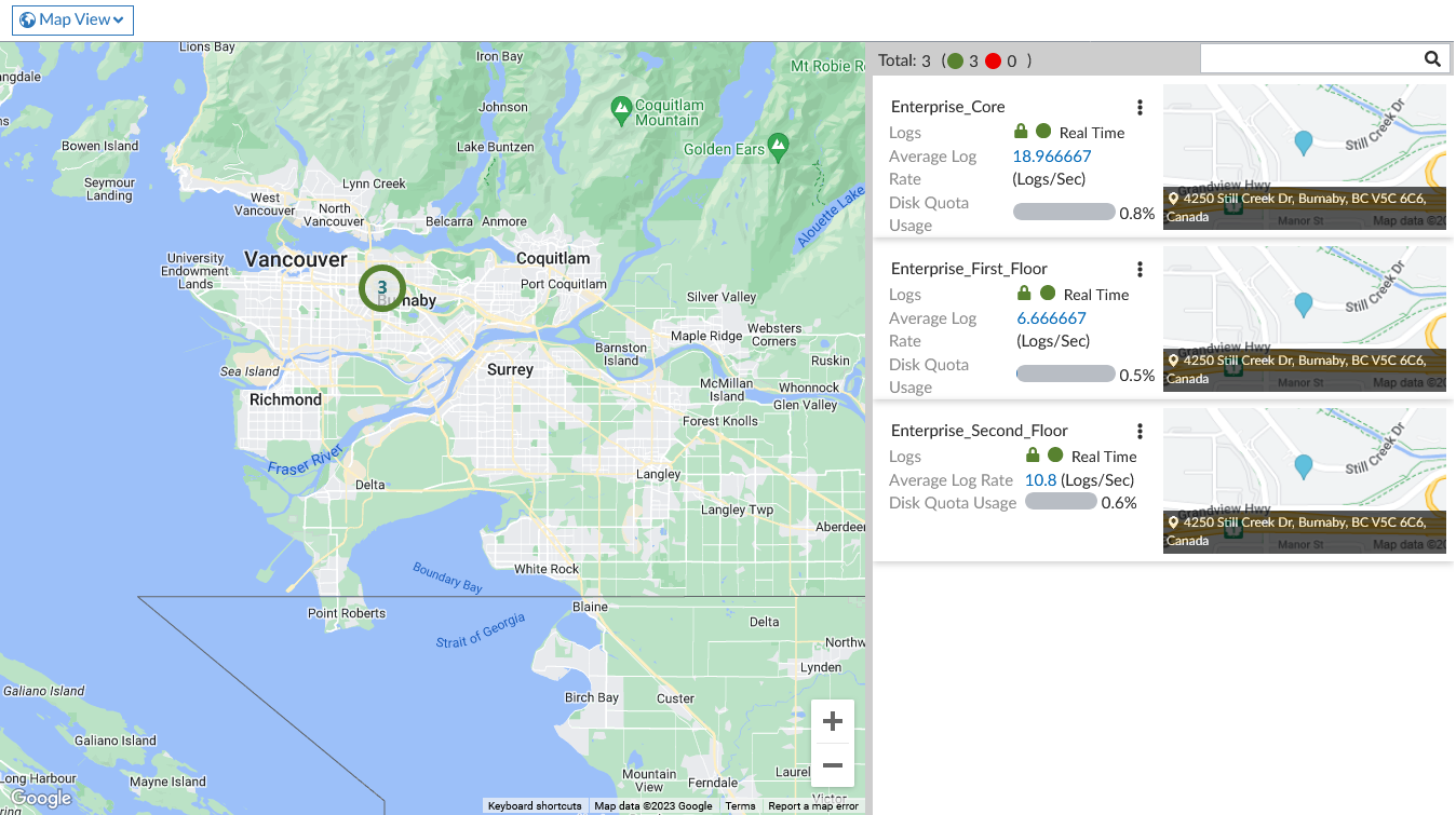 The Map View provides an interactive map displaying the physical locations of authorized devices. You can navigate the map by using your mouse. Zoom in or out with the scroll wheel or with the plus (+) or minus (-) buttons on the map. When zoomed in, only the devices that are currently visible on the map are displayed in the sidebar. The sidebar provides information about the devices, including logging status, average log rate, and disk quota usage.