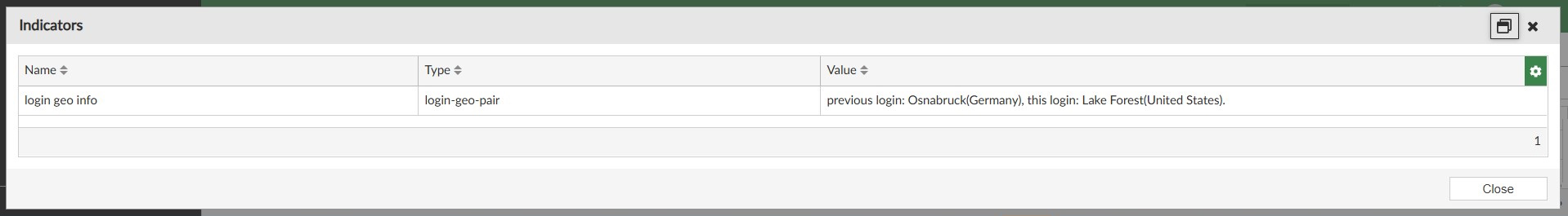This rule is also configured to create indicators to display the previous login and new login location. If the alert is updated, you can also see the new geo-login information in the indicator as well.