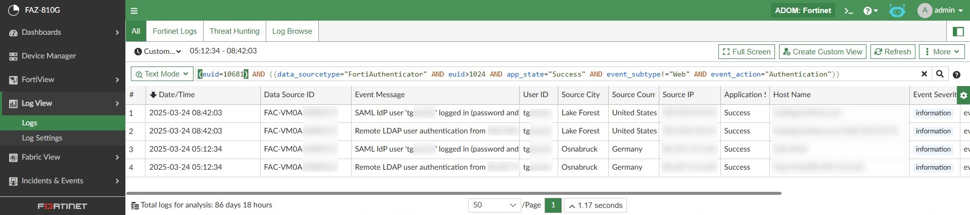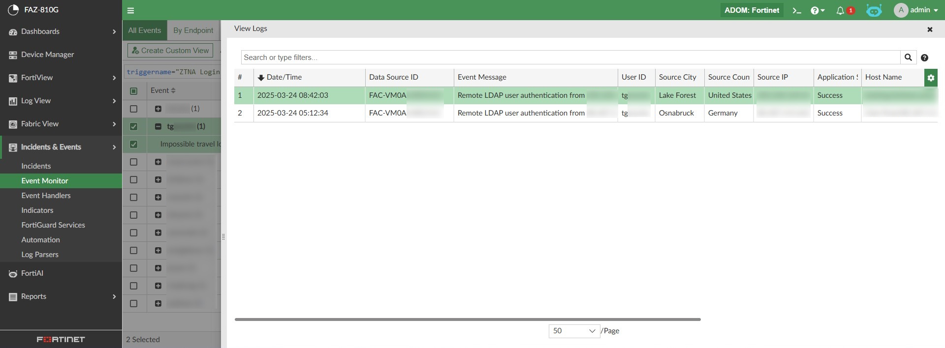 For this rule to trigger events, you must also have a FortiAuthenticator configured in your network and logging to FortiAnalyzer. |