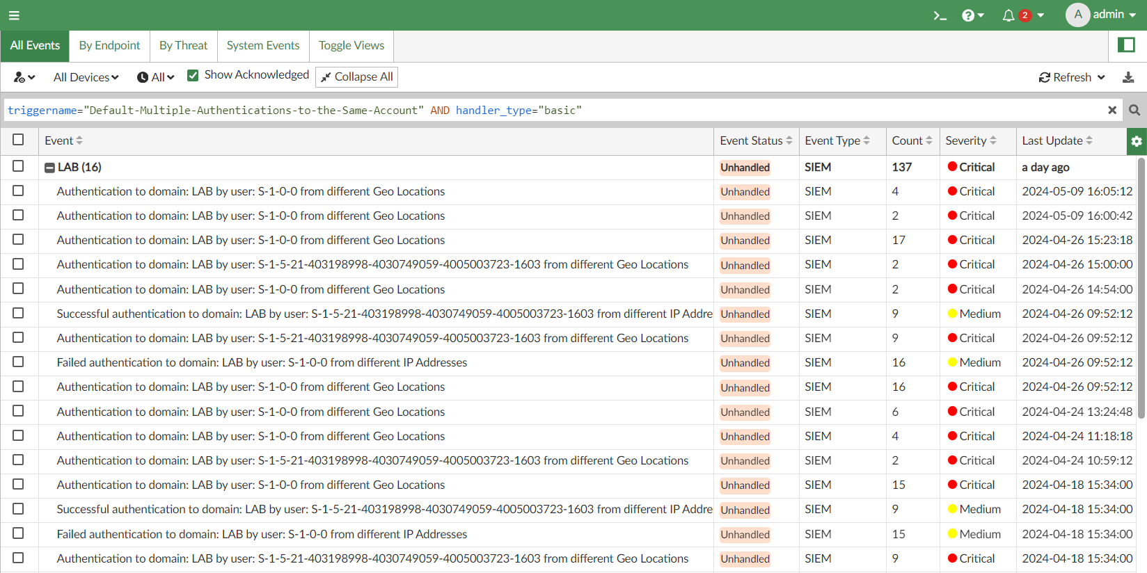 Default-Multiple-Authentications-to-the-Same-Account is a basic event handler detects multiple failed or successful authentication attempts to the same network device or domain using the same account but originating from different IP addresses or geo locations.