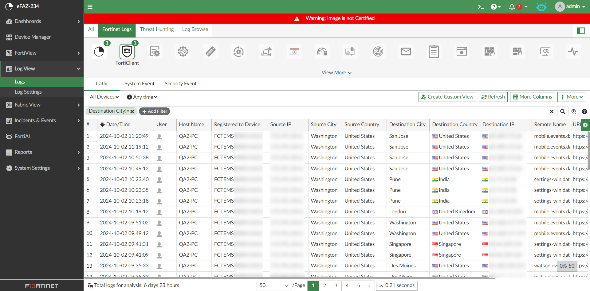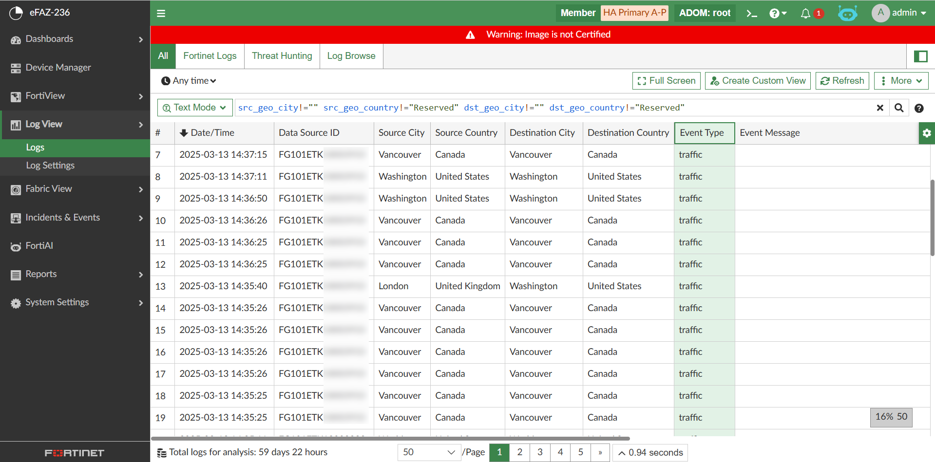 For example, see the Fabric logs with Source City, Source Country, Destination City, and Destination Country populated in the table view.