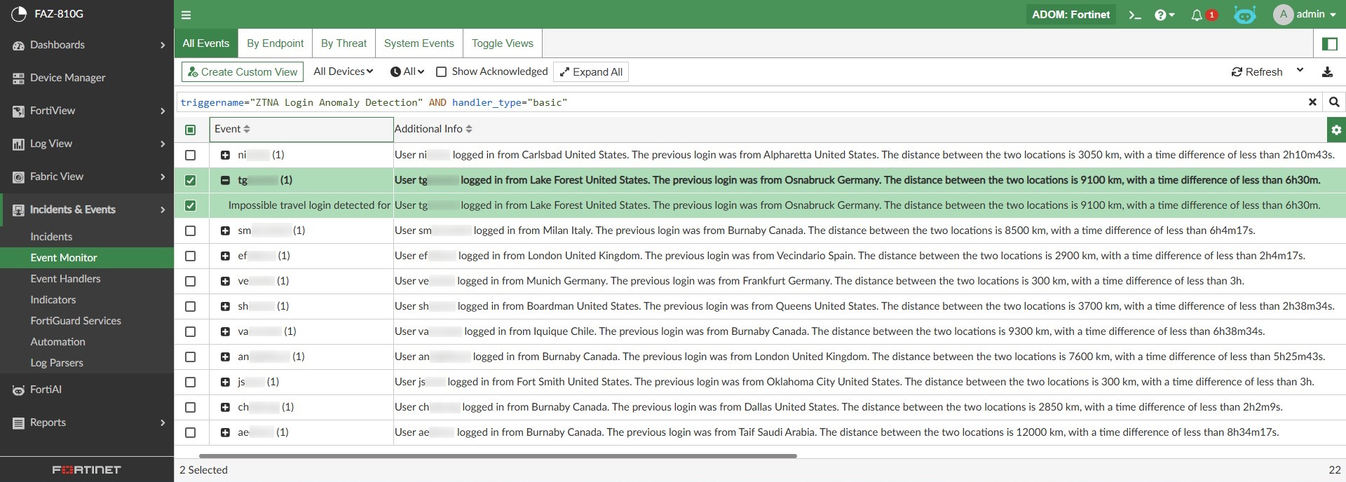 You can find the Impossible Travel Login Detection rule in the predefined ZTNA Login Anomaly Detection event handler.