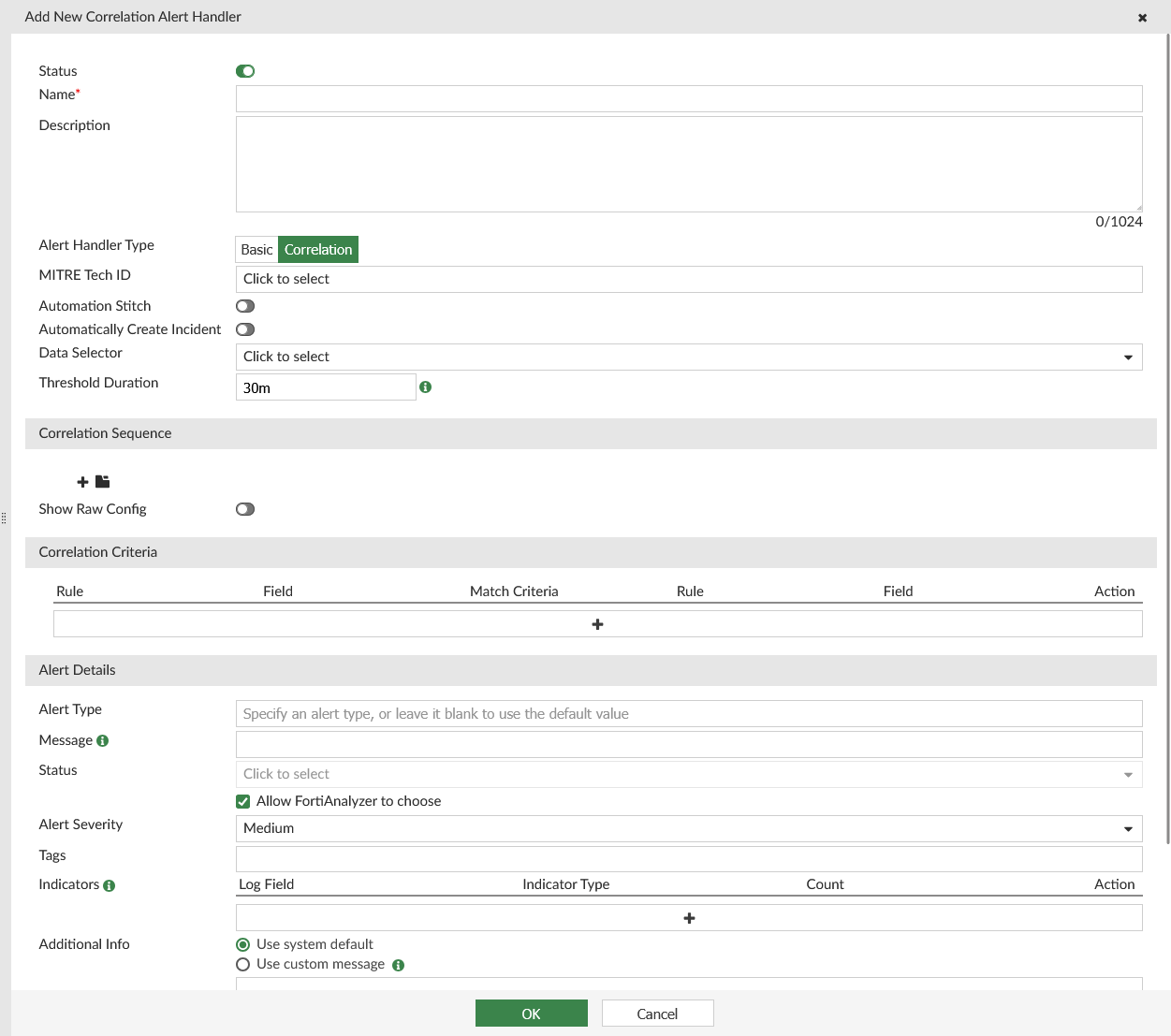 The name, description, alert handler type (correlation), MITRE techniques, automation stitch, data selector, and threshold duration for the correlation handler. You can also enable the alert handler to automatically create an incident, if needed. |