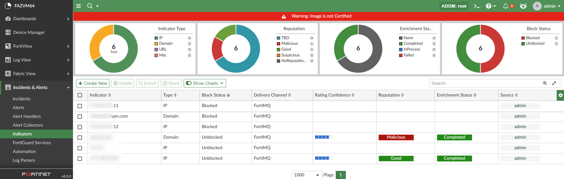 In Incidents & Alerts > Indicators, there is a pie chart and column to display the Block Status of the indicators: TBD, Blocked, and Unblocked.