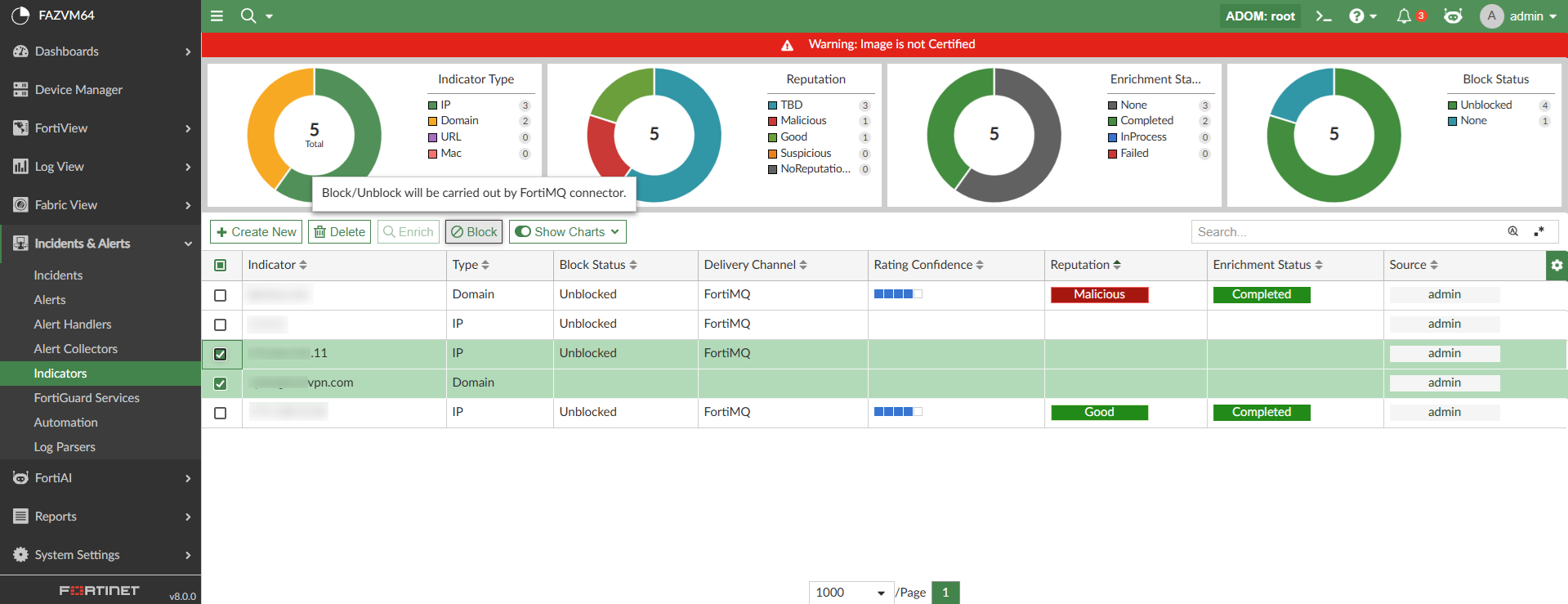 Indicators can also be unblocked from the FortiAnalyzer GUI as well. When a blocked indicator is selected in Incidents & Alerts > Indicators, the Unblock action becomes available in the toolbar and shortcut menu.